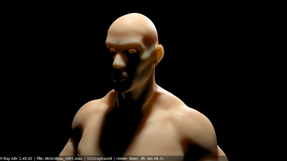 A test with the new V-Ray Alsurface shader just implemented by Vlado. I just pout it on my WIP anatomy model (I call him Monsieur Groleau) I am creating in Zbrush and did a turntable to see how it’s going. Far better than the vray sss2 shader!
