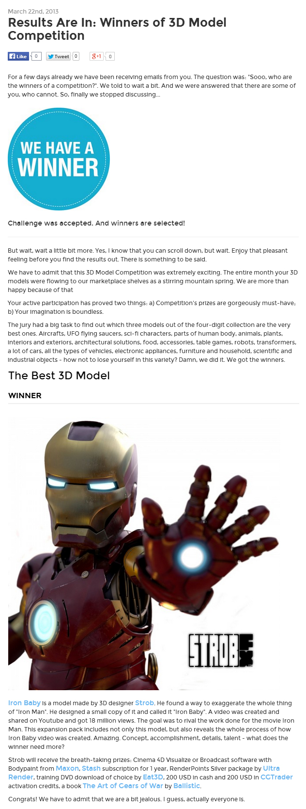I won the first prize in a CGtrader.com competition for the best 3D model in 2013. It came with the following prizes: